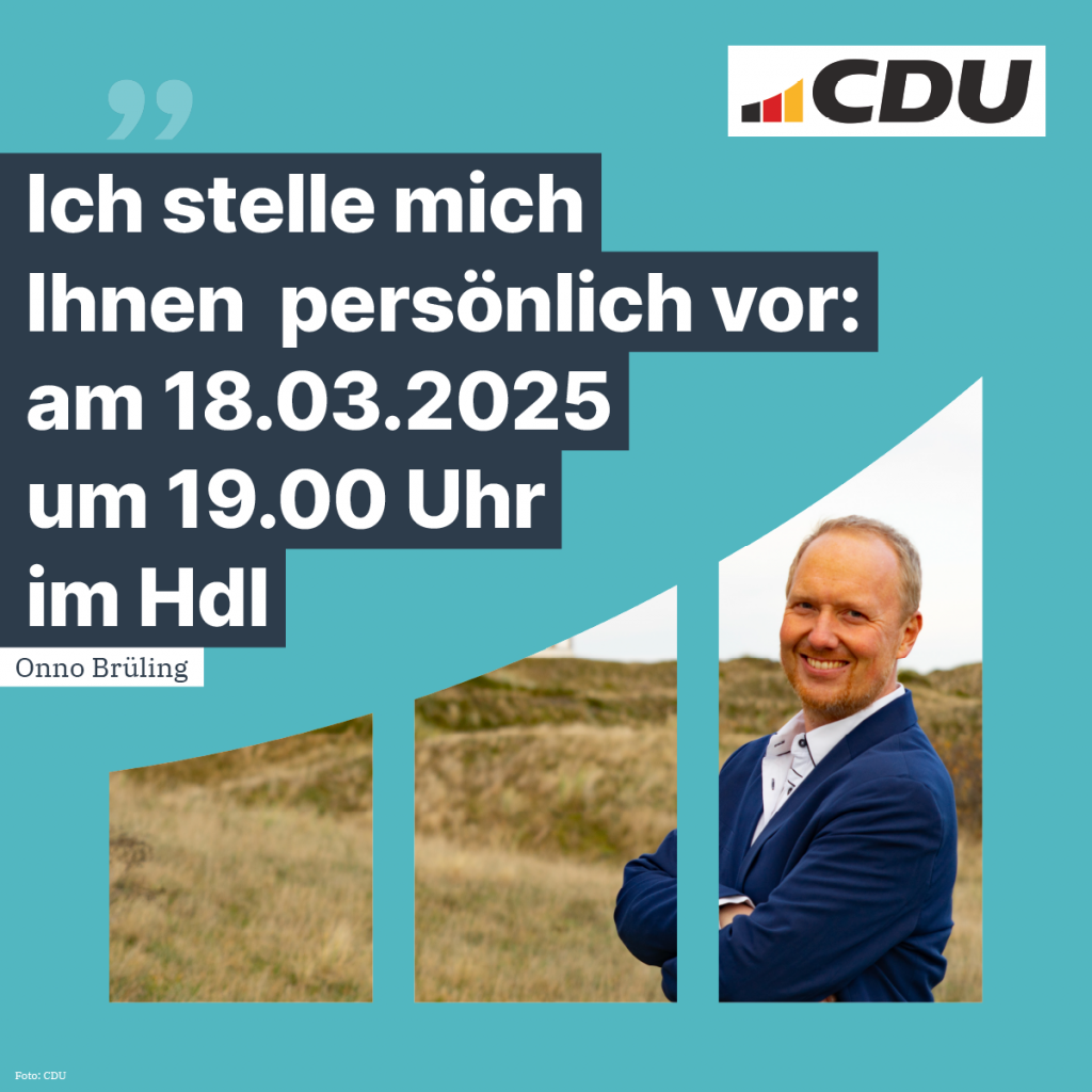 Onno Brüling stellt sich und seine Pläne für die Insel Langeoog am 18. März um 19 Uhr im HDI vor. Eine herzliche Einladung an alle, die ihn kennen lernen und Fragen stellen möchten, die mehr erfahren möchten. Die Wahl zum Bürgermeister für Langeoog ist wichtig – nutzen Sie die Gelegenheit und kommen Sie vorbei.